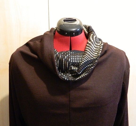 Je m'en suis servi pour une petite finition sympa d'un pull à col que j'avais déjà réalisé Ici : le "Drape front". Cette fois je l'ai réalisé dans un jersey côtelé fin et doublé au niveau du corps avec un jersey fin lisse, le tout dans le même coloris.